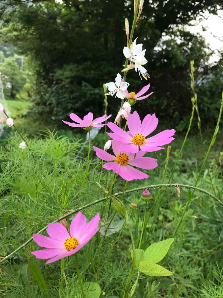 コスモスとガウラ、風に吹かれて心地よさそうです🌿🌿
