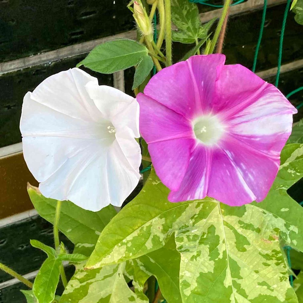 白とピンクの朝顔、綺麗ですね🌟朝顔は朝のうちだけで、本当にもったいない😥
