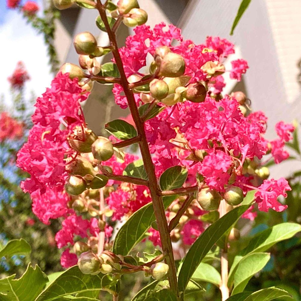 通り沿いのマンションの植え込みの真っ赤な百日紅❤️