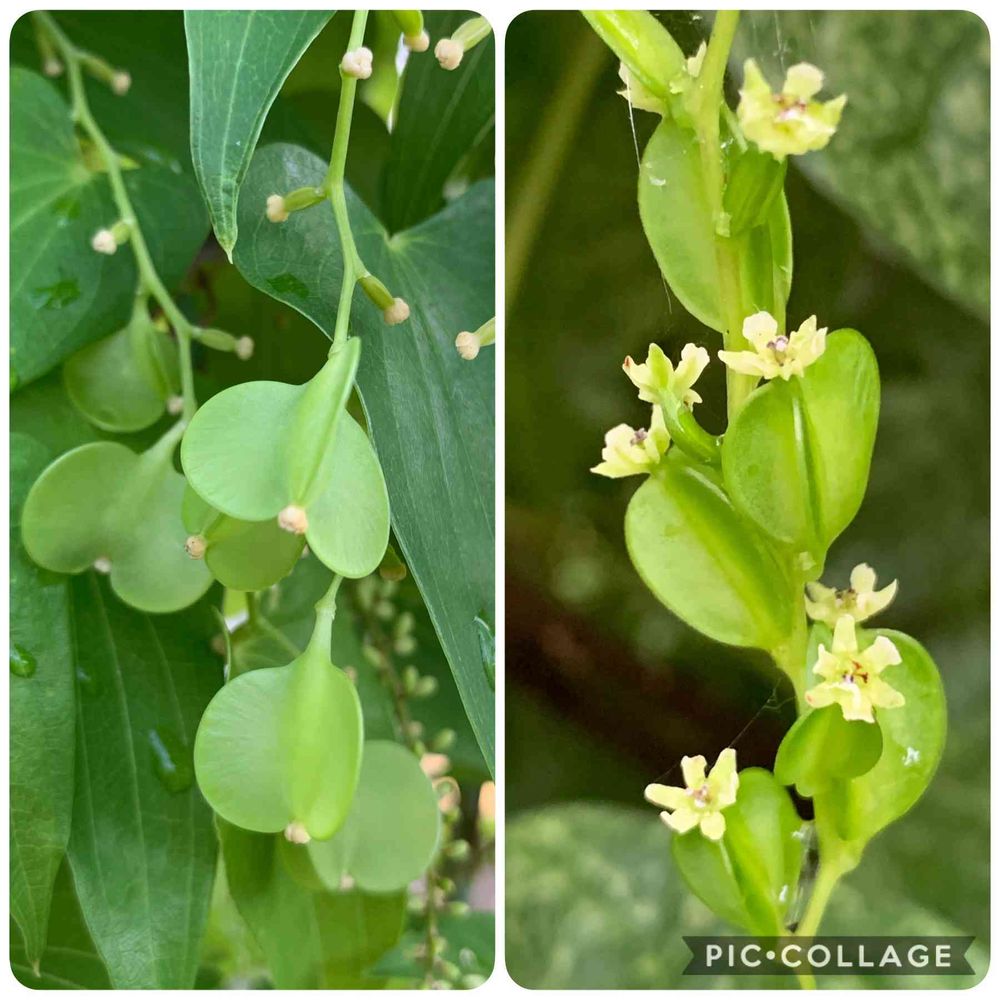 オニドコロとヤマノイモは、3枚の羽状の翼は、同じでも、オニドコロの方は、翼の形は半円形のヤマノイモの実より細長い形をしていて、花が上についるのですね🤔