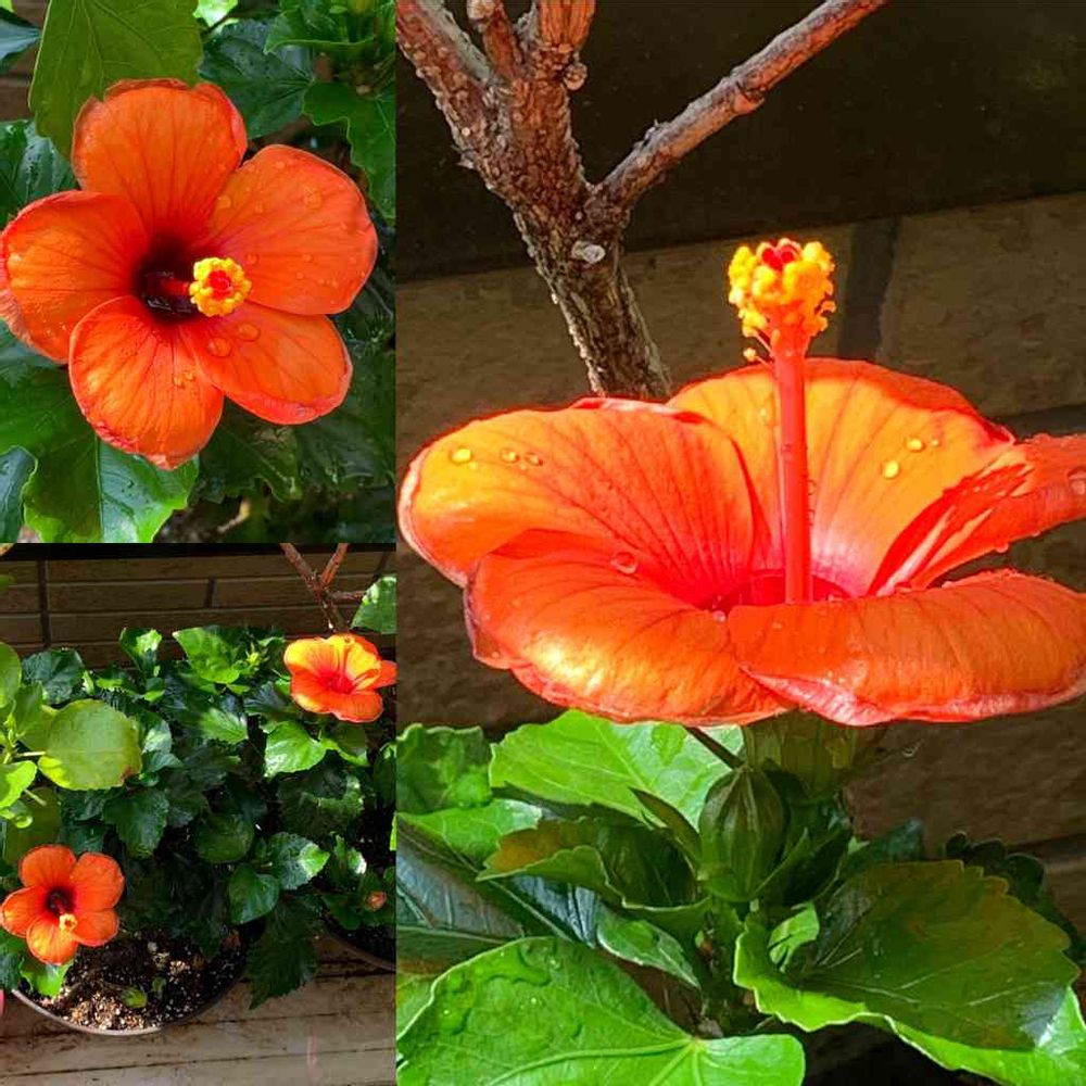 暑さが原因なのか、オレンジハイビスカスの花びらに縁がめくれて丸まっていました😀