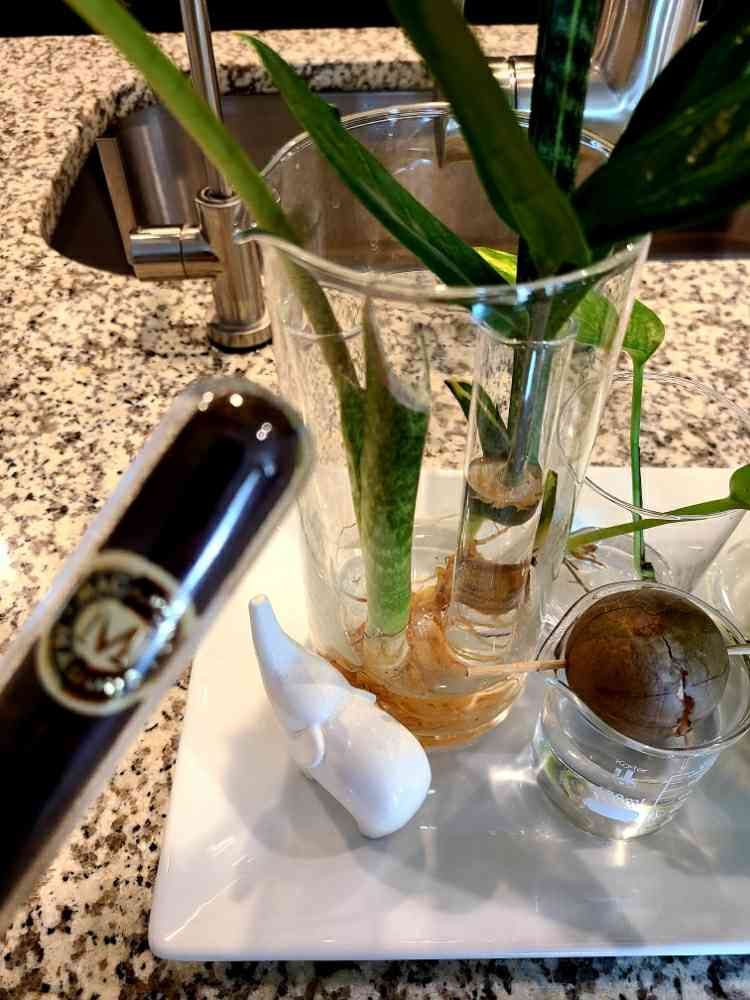 キッチン植物ナーサリーのお役立物💚たまにスコッチと吸う葉巻🥃入っているグラス容器が試験管🧪くらいで、1本挿しに丁度いい🌱