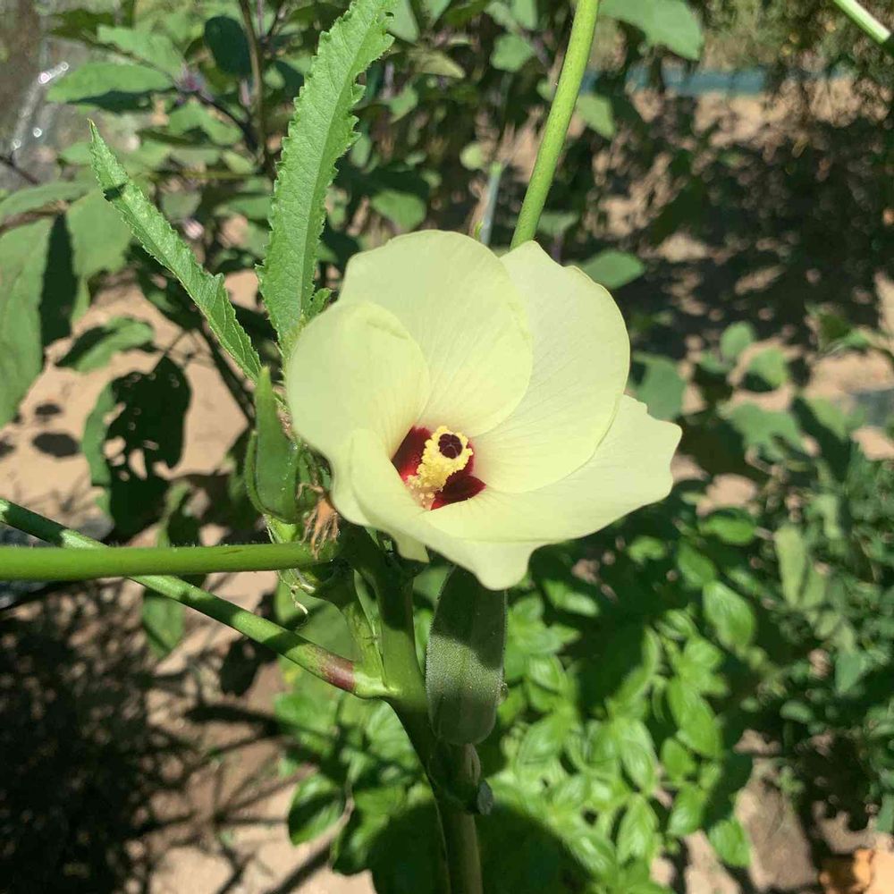今日の畑。こちらはオクラの花♡和綿に似てますよね!ウチの畑にある和綿、オクラ、ローゼルは属は異なりますが、全てアオイ科です。葉っぱの形やお花のシルエットがかなり似てますよねー(^^)♪