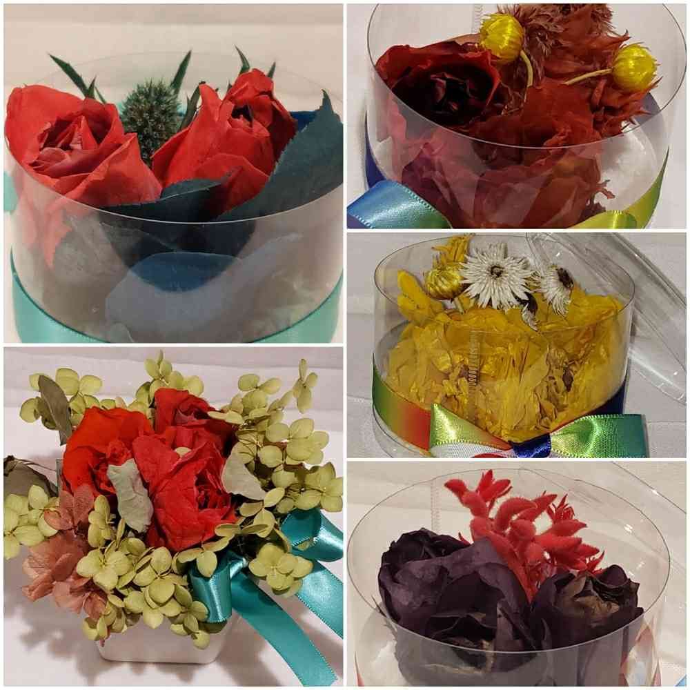 自宅のお花たちを、チマチマとプリザーブドフラワーで仕上げたのが貯まってきたので、プラスチック容器に入れて纏めてみました~😊