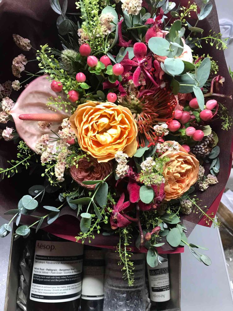 娘達から貰った花束と息子から送られてきたスキンケア用品です☺️