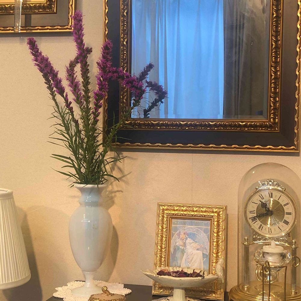 壁掛け仏壇「鏡壇ミラリエ」に今日(8/30)の誕生花の「リアトリス(麒麟菊)」を飾ってみました。