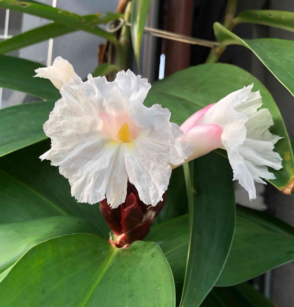 おはようございます。散歩道の民家に背丈の高い葉が大きな植物に白い花が。初めて見ました。調べてみると福神草だそうです。 花は5〜7センチの大きさ。