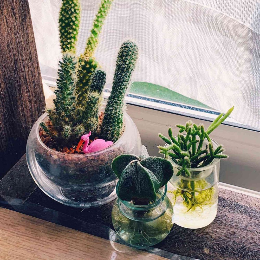ガラスボウル植えのサボテンたちは室内で徒長しまくりですが……ここにいてほしいので気にしない(笑)