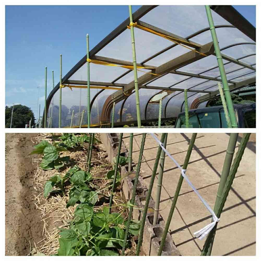 台風の季節が来るから支柱は頑丈にということで、太い支柱を車庫にくくりつけ、その支柱に横棒を渡し、細い支柱で間を補いました。
