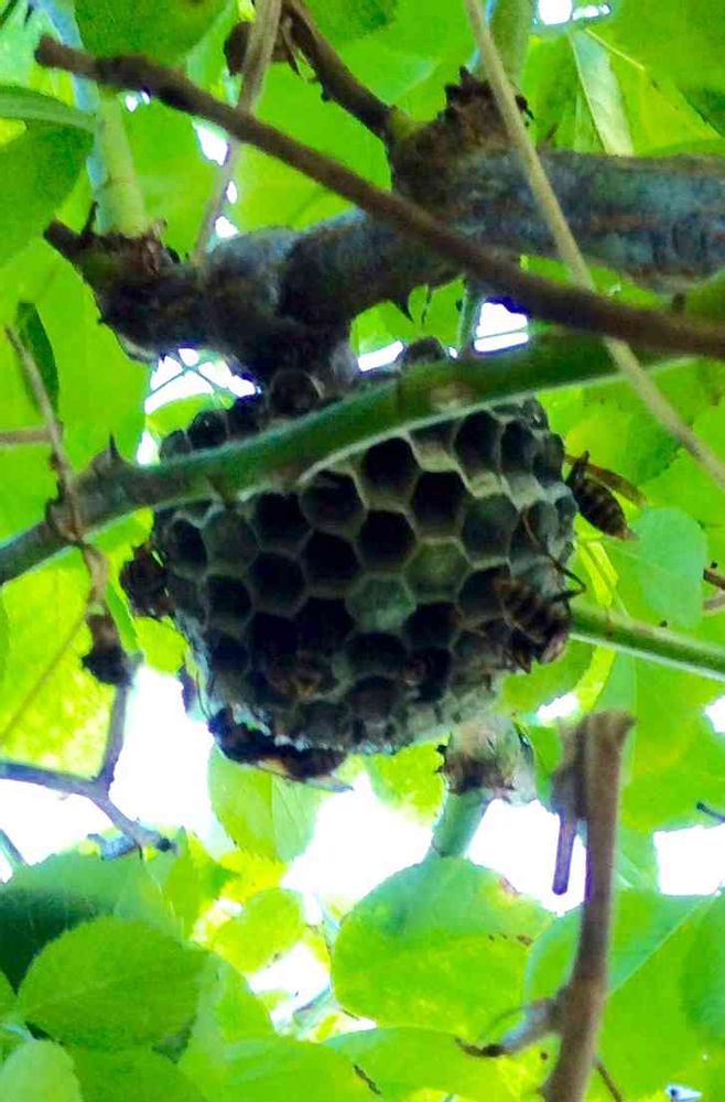 でもアシナガバチはイタズラさえしなければ益虫らしいので間貸しする事にしました。家賃がわりに害虫を獲ってもらう条件で😓…この下を通る時はそーっと通ってます。