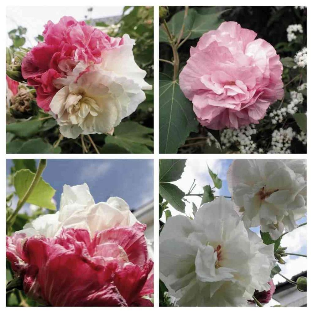 楠玉酔芙蓉が咲いています。朝は白く咲き、昼頃にはピンクに変わってきます。次の日にはちょっとしおれ気味の濃いピンクになります。一重の酔芙蓉と違って、部分的に色移りのスピードが異なって二色先のようになるお花もあり、楠玉酔芙蓉の特徴になってますね(*^^*)毎年冬にはほぼ根元から切り、春に伸びてきた新梢を5月にカットするのですが、今年は5月にカットした後もすごく伸びが激しくて、6月に再度切ろうかと思ってみたら、すでに蕾が出来ていたので断念してそのまま伸ばしたら、ものすごく背が高くなって、2階からでないとお花を表から見れないという事態に。。。💦写真を撮るためにしたから枝を引っ張って無理やり下に向けて撮ってます😅今年は梅雨が長かったせいでしょうか?もうちょっと背丈を低く抑えたいなあと、来年に向けて反省中ですヾ(≧∇≦)ノ