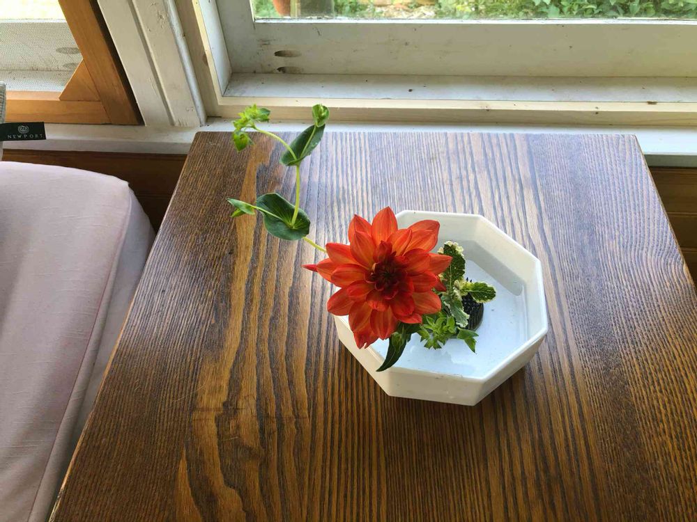 唯一男性生徒のステファン君がダリア持参でお稽古に来ました。たくさんいただいたので私もひとつ。折れて短いダリアをどうすれば良いのかと聞かれ、生けたのがこれです。花材はダリア、ブプレリウム、パイナップルミントです。