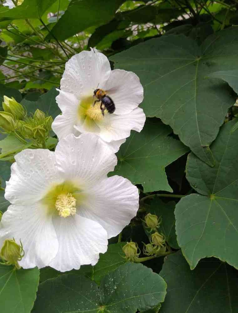 真っ白の芙蓉に蜂さん誘われて🐝可愛いですねぇ。