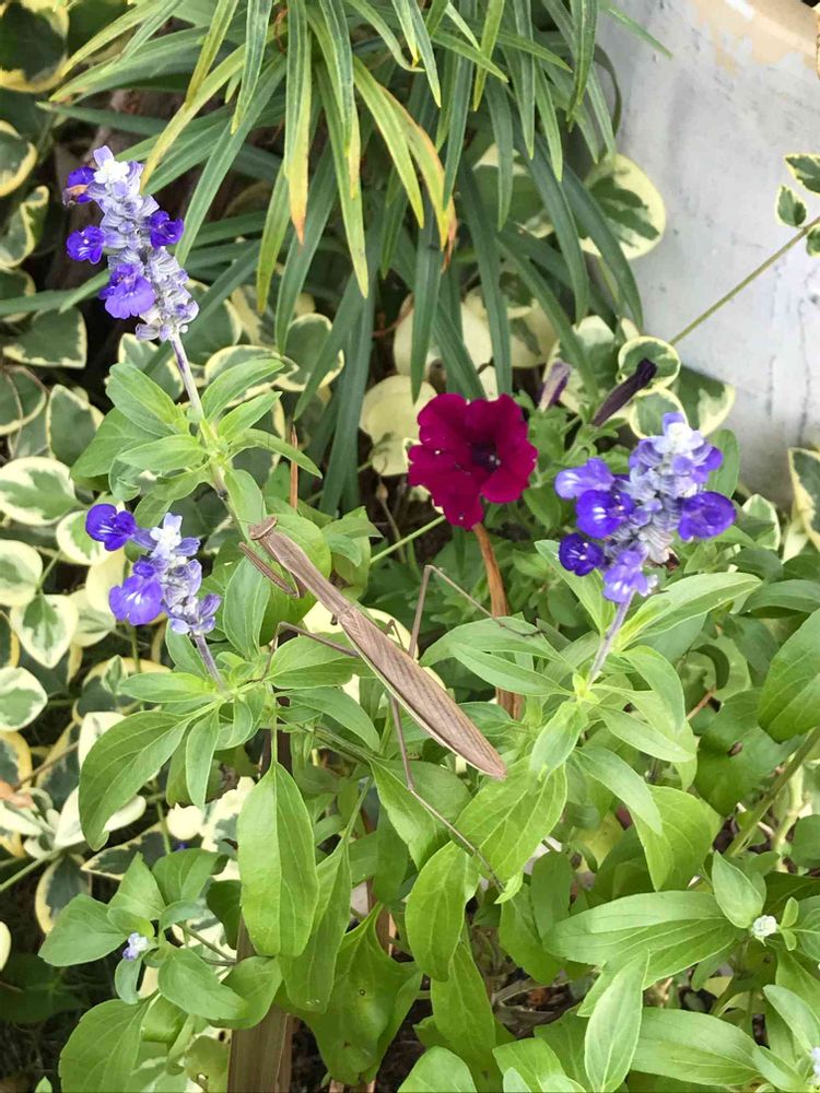 今日の玄関前のブルーサルビアにカマキリが遊びにきてました😊☘️🍀