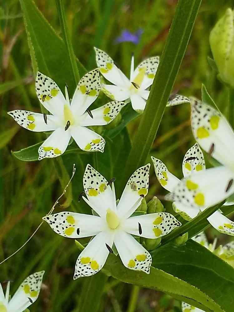 高層湿原に、こんなに素敵なお花が咲いていました。白い花びらに2つの緑色の斑点と複数の黒い点がとても印象的なお花✨🌼💚