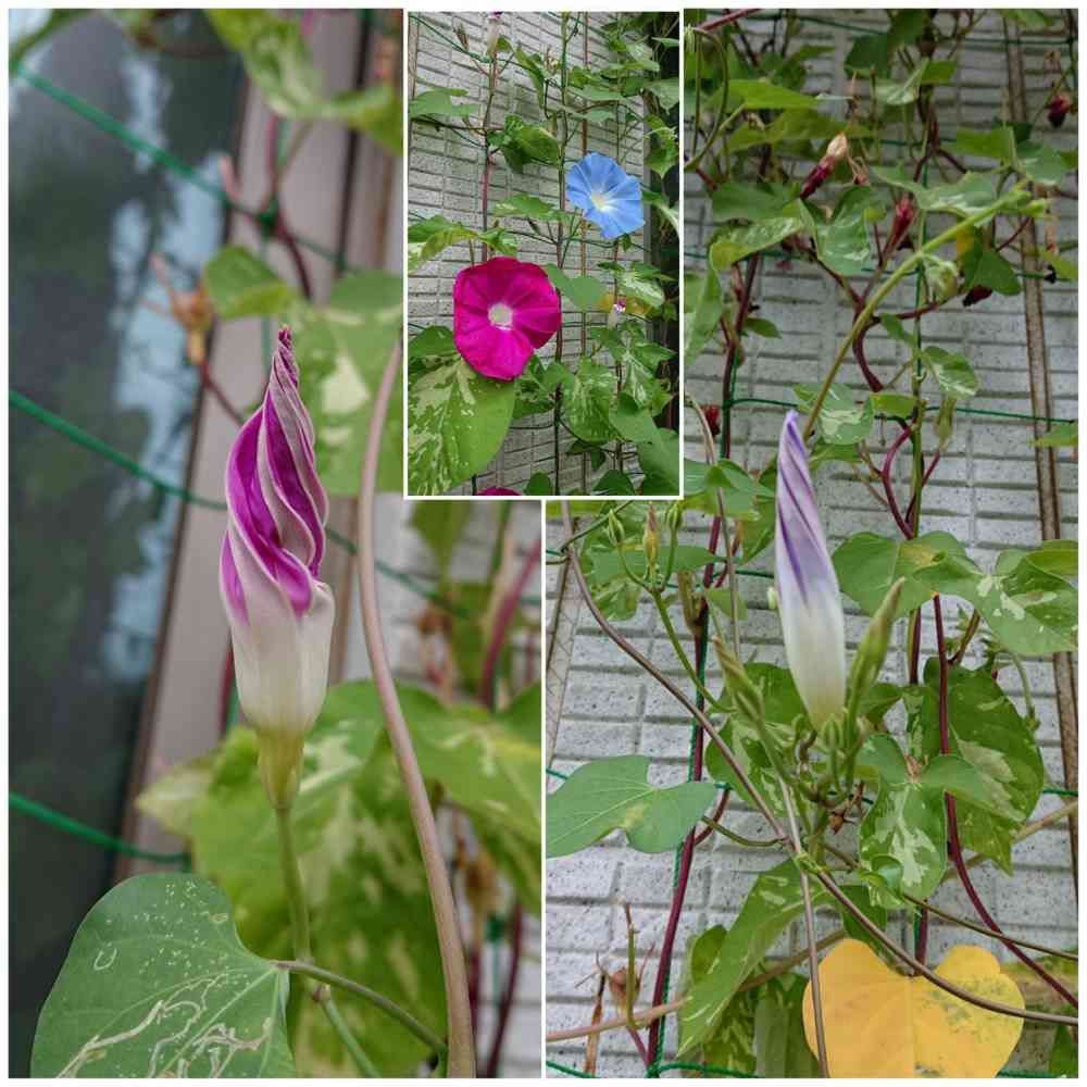 こんばんは🎵。ちょっと分かりにくい Pic. でごめんなさい。朝顔のつぼみを載せました。淡いブルーに恋濃いピンク❣️。蔓もだいぶ草臥れてきましたね。がんばれ✊‼️朝顔❗。