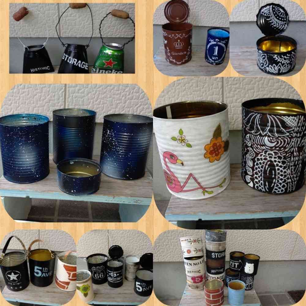 せっせか作り貯めてこんだけできたリメ缶。お気に入りは宇宙缶。オリオン座とか入れれるようになりたいな🎵