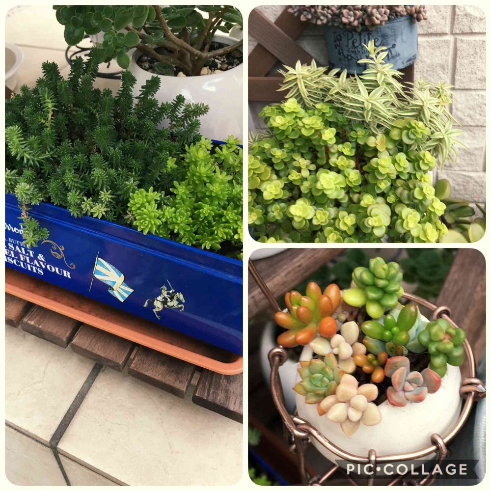 今こんな感じです(^O^)何とか枯れずに元気❣️お水を少量頻回にあげてみたところ蒸れもせずモリモリ増えていい感じです😊途中カットもしましたが、また増えてます😆小さな寄せ植えも可愛く維持できてるかなぁ😅
