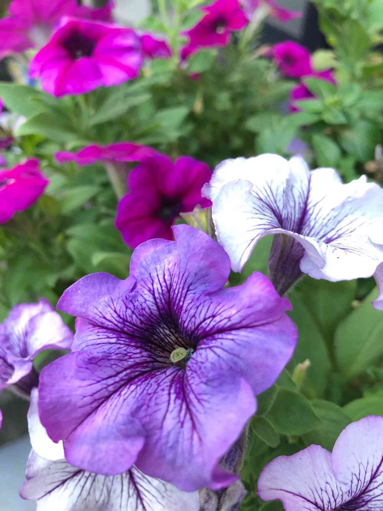 💗ペチニュアの紫色😭今年寄せ植えした3株は全滅まさにこの色紫色💜🤍💖白とピンクも。😭古株の何年もののペチュニアだけが生き残り🥺元気がいちばん