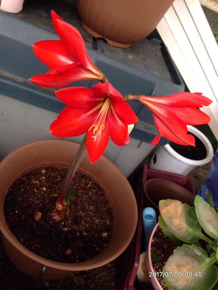 5月末に植え付けた アマリリス パークレッドが花開きました㊗️🙌