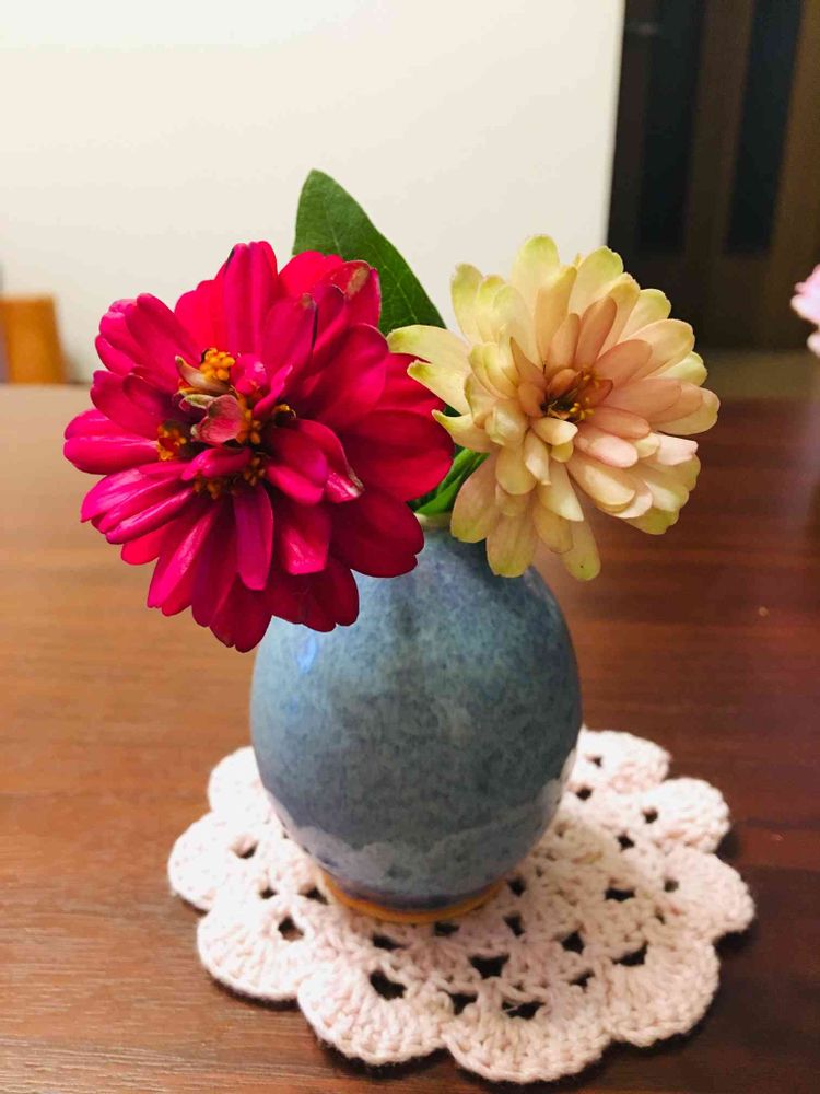 今日も1日、お疲れ様でした🌸ジニアを、萩焼の一輪挿しに挿してみました😊