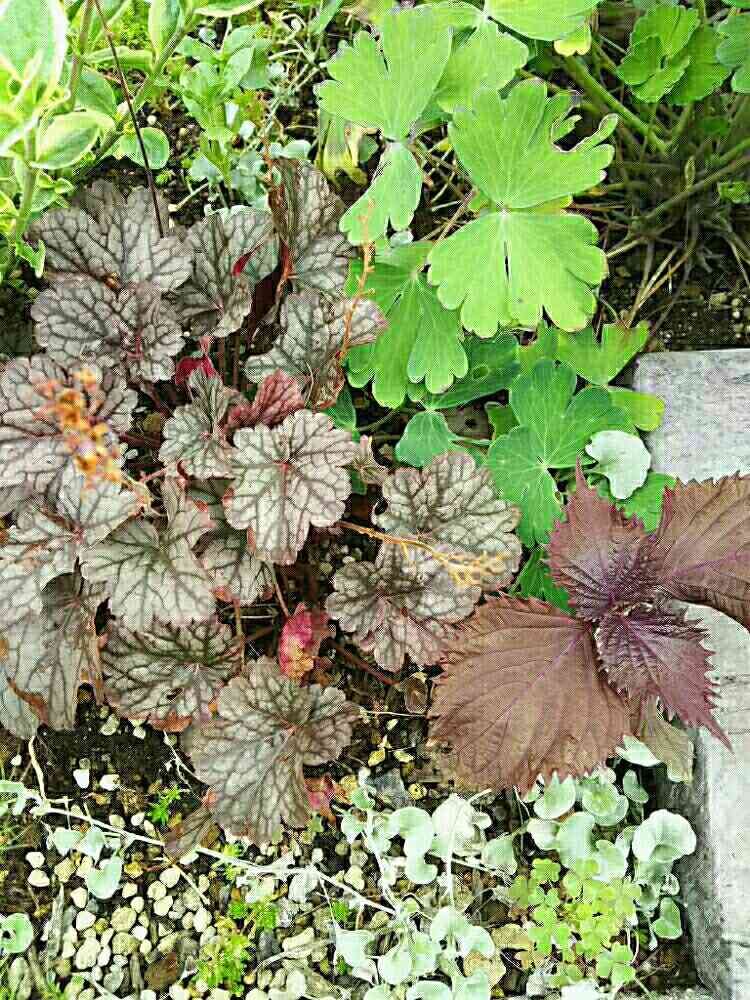 ヒューケラのふりして生えてる😁・・・ってどこからやって来たの?赤紫蘇さんですよね⁉