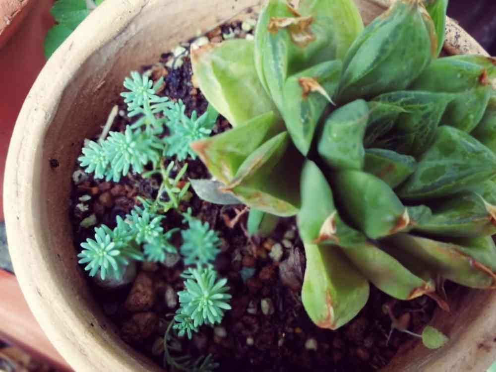 ごみステーション付近に生えているセダム、ご近所さんが植えたものが飛んだのかどうかは分かりませんが、敷地外の道端なので、一枝もちかえりハオルチアの横に挿して置きました😃