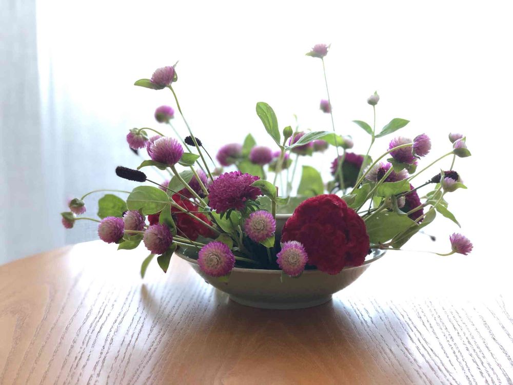 ケイトウ、ワレモコウ、キク、千日紅