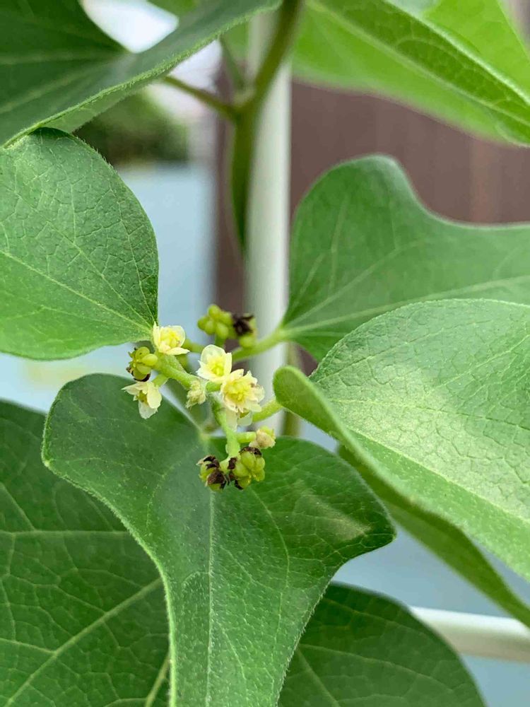 いつも黒い実が出来てから気が付いていましたが、こんなにかわいい小さな花だったのね🌼