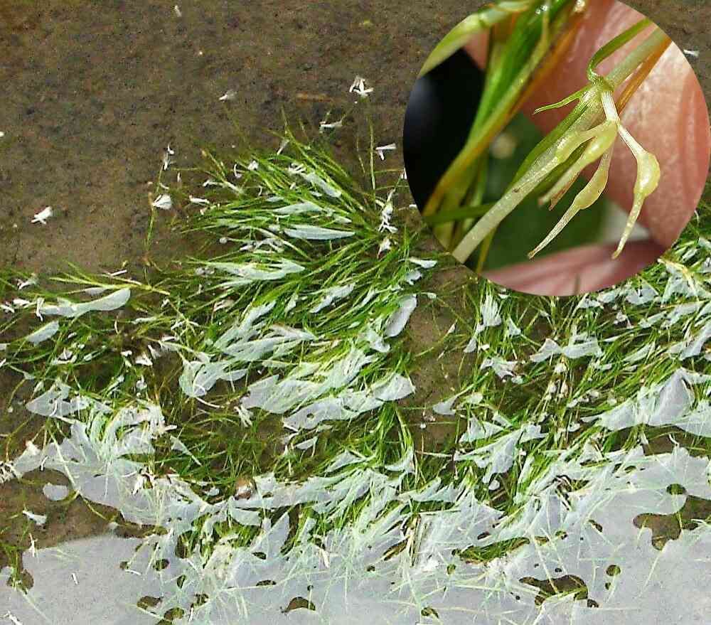 名前がかわいそうな、面白そうな植物で必死で10年間探しようやく見つけました😱四国では100年くらい前に香川県で発見されて以来見つかっていなかった超レアな水草です😅胞子で殖える藻ではなく、上の丸の中のように花や種がつく種子植物です😆