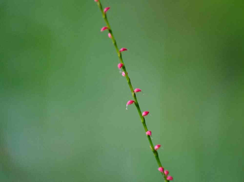 私が惹かれたのは、この細い枝にチョンチョンと赤い小さな花がついている、線の細い植物でした。小さくてもこの赤いのが緑の中でピリッと目立っていました。