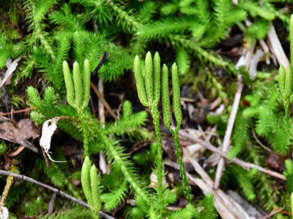 ヒカゲノカズラの胞子嚢穂です。成熟すると白っぽくなり、胞子を放出した後は垂れて、風に靡くような姿になります😆