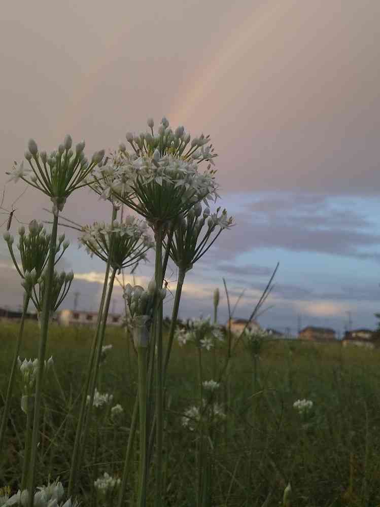 今朝のにらの花と虹🌈のコラボ~💚台風被害無いことを願いたいですね➰😅