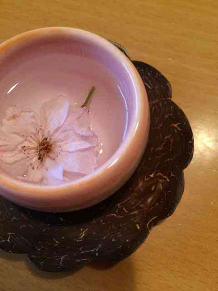 まだ花が綺麗だったので、桃色のおちょこに水をはり、浮かべてみました。桜木で作ったお皿を添えて、、。