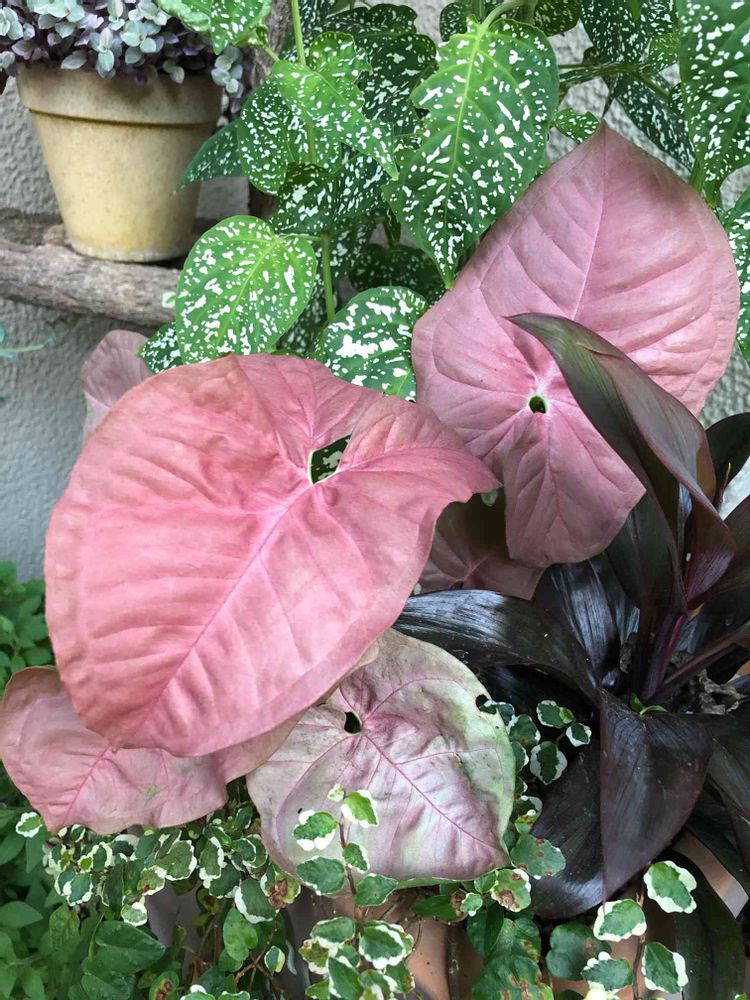 ダイソーのピンクシンゴニウムはこの夏とってもたくましく大きくなってくれました❣️寄せ植えだけど今日は主役で!