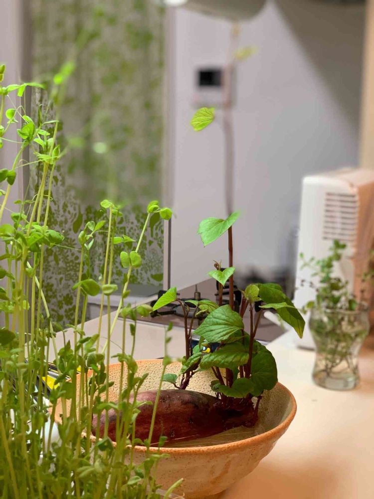サツマイモ🍠と豆苗🌱、、、豆苗は2回目頂くとして、サツマイモはこのまま、土に植えた方がいいのかどうなのか、、