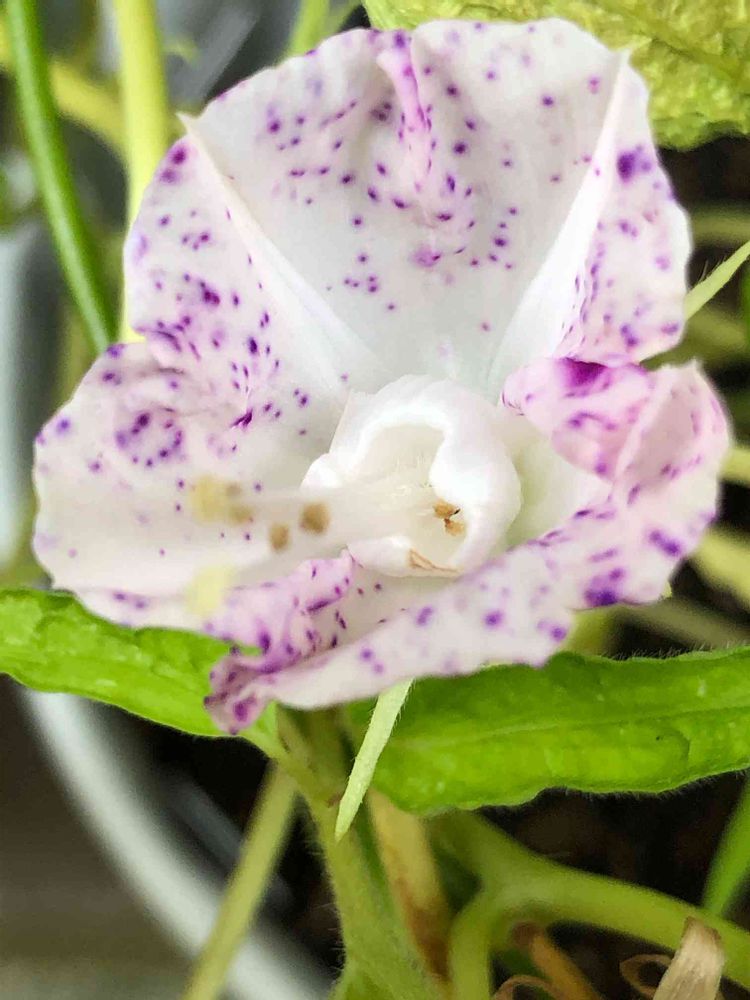 朝顔 1095 黄縮緬立田唐草葉白筒台咲青吹掛斑点