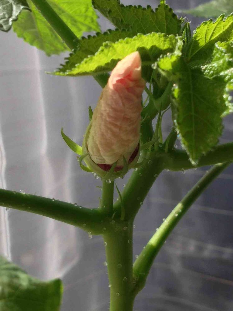 小さなオクラ状の物体の先だけがお花になるのだと思いこんでいたが、その物体は丸々花芽だったようで気がついたら2倍以上の大きさの花の蕾と化していた。何がどうなったらこんなスピードでこの状態になるんだ。