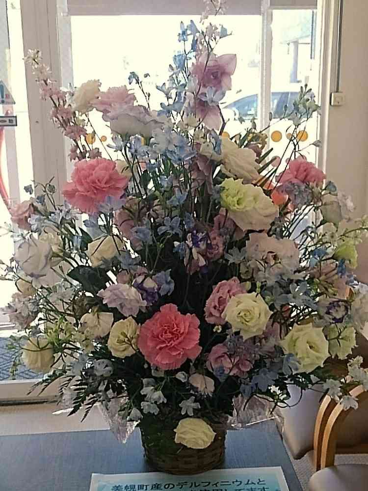 お薬を待つ間、優しい色で生けられた花、(*´-`)。*・゚゚