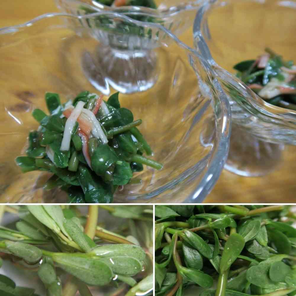 今回は10~15cmくらいに育ったスベリヒユを軽く湯がいて湯切りしてから、玉葱入りの甘みのある黒酢ドレッシングと和えてみました。