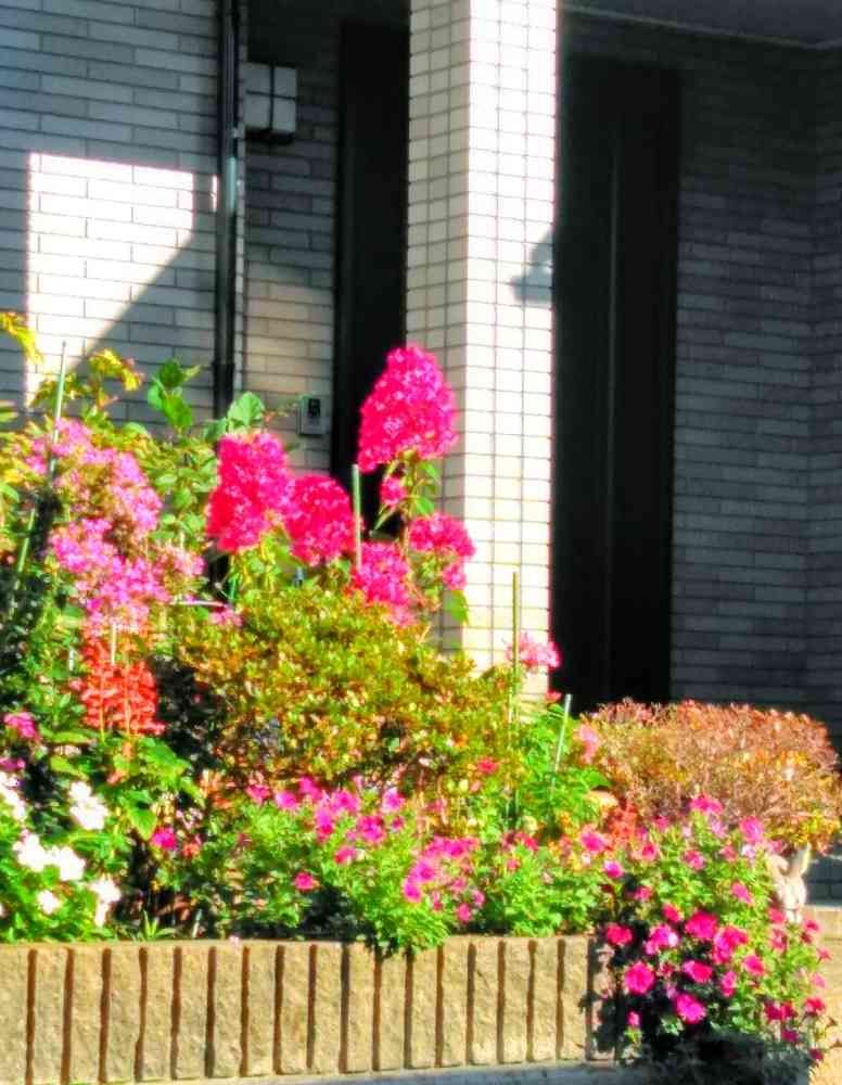 今朝の散歩道の帰り道、ご近所の玄関先の花壇です。色々なお花が咲いて、綺麗でした。