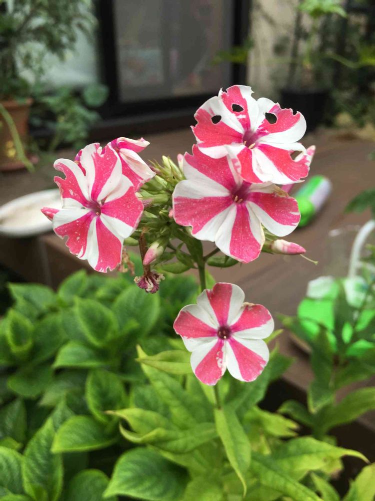 フロックスも咲き始めました。虫食いですが💦💦ペロペロキャンディのようなかわいい色の組み合わせに去年一目惚れ💕💕今年もこれからたくさん咲いてくれるかな😊