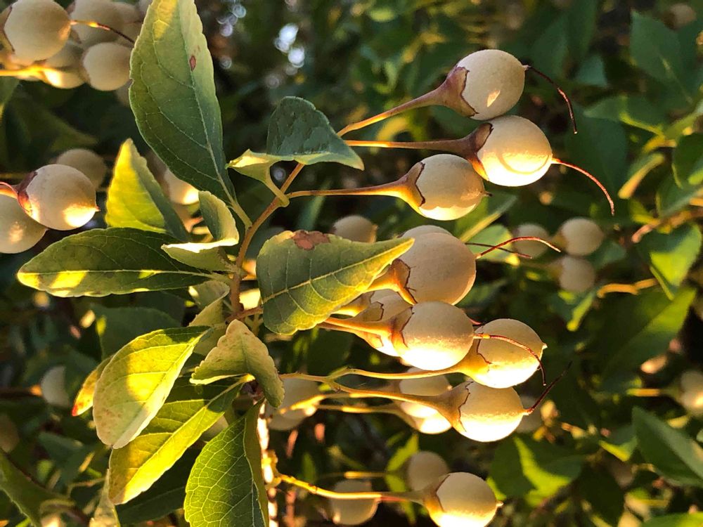 おはようございます。朝の散歩道。エゴの木の実が朝陽にまぶしく。もうすぐ野鳥がついばみに。