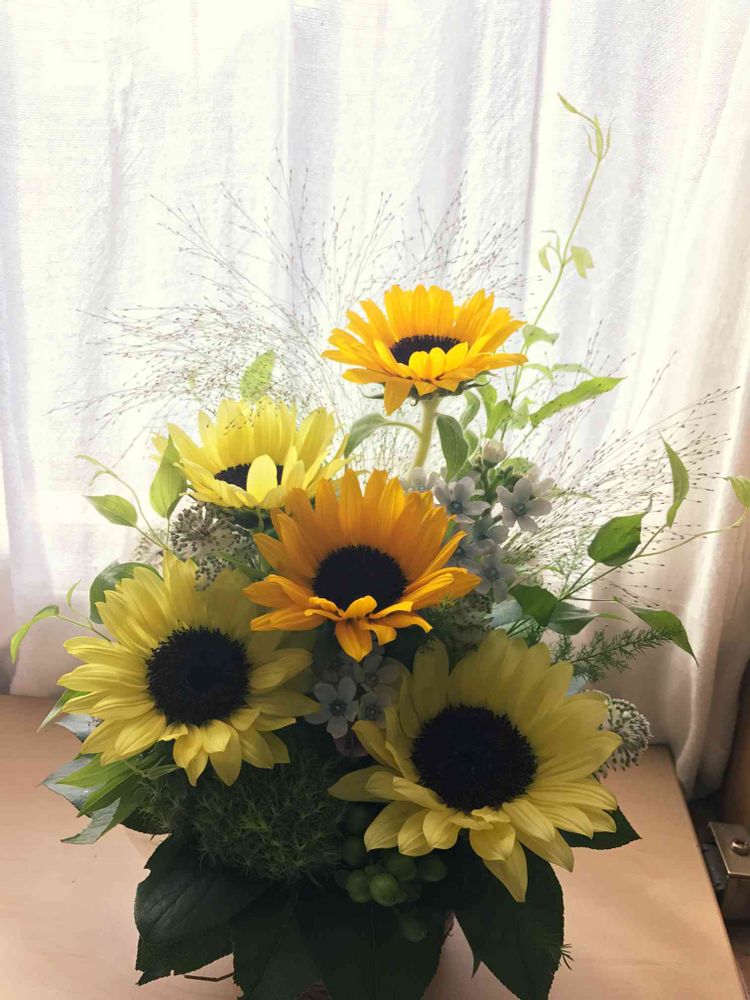 ひまわりを使って夏らしく、でも涼しげにアレンジメント作ってみた。