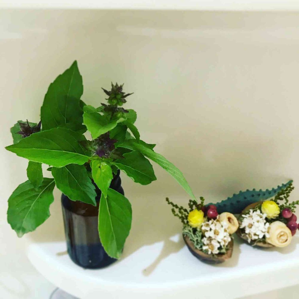 ホーリーバジルの花が咲いたので、洗面所に飾ります😊良い香り💕