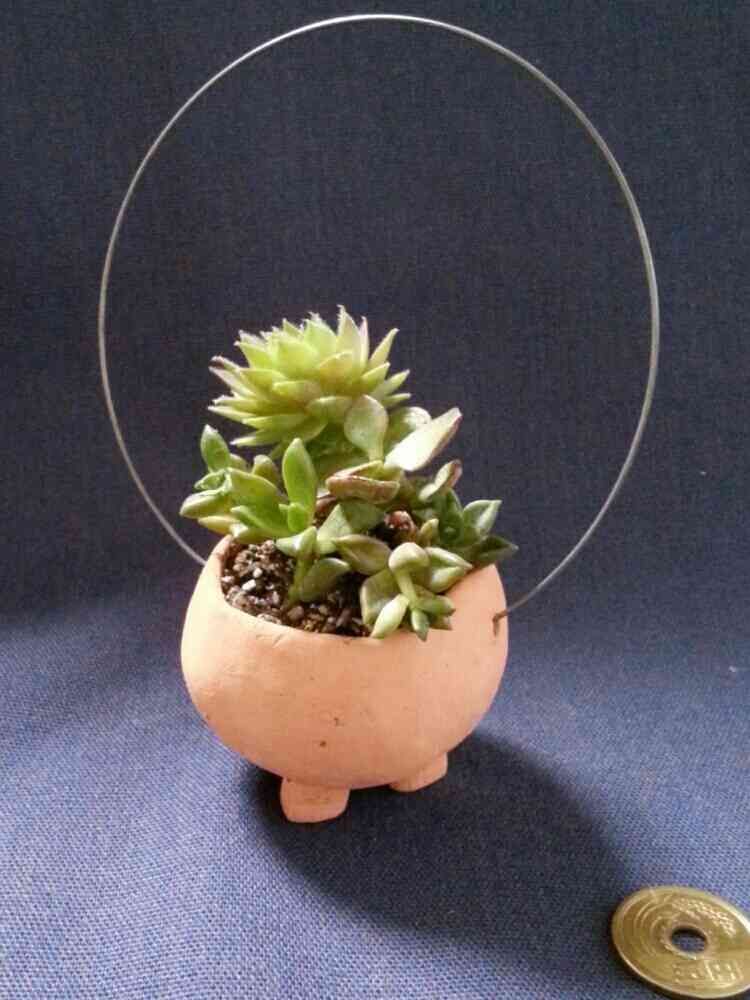足つきの手作りテラコッタ鉢に小さな多肉さんを寄せ植えしました。