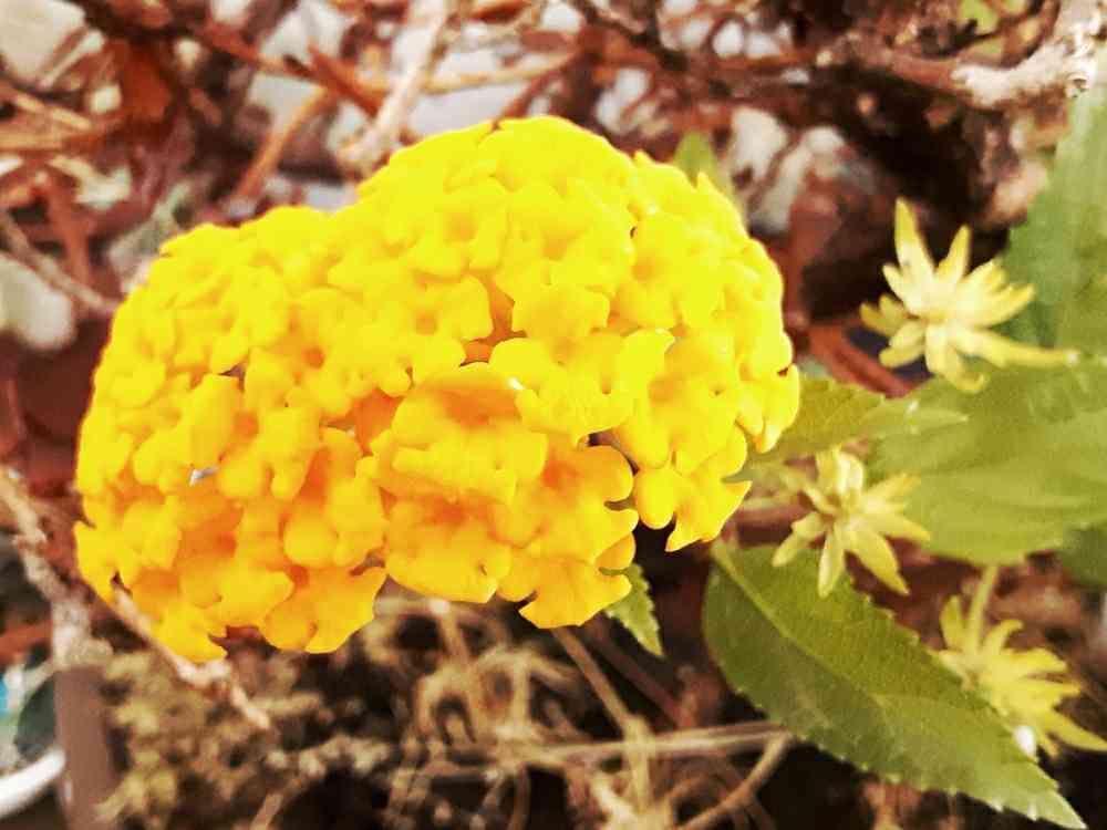 レモンランタナです。たまたま二つの花がくっついて咲いてました。一つの花の様に見えるのも実際は小さな花がいっぱい寄り添う様に咲いて一つの花の様に見えてます。ランタナも紫陽花の花の咲き方に似てますね。