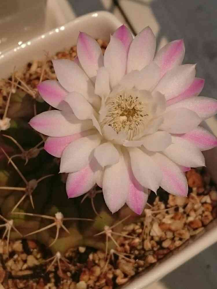 咲いたんですねー。おめでとうございます🎉ホントにキレイです👍ピンクと白が混ざってていつまでも見ていたい感じなんでしょうね。アップありがとー!