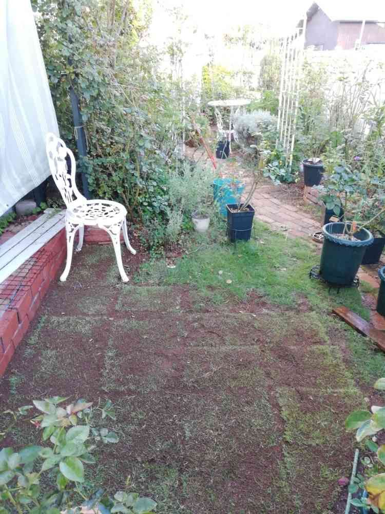 まだまだ暑いですが、雨が降る季節が近づいて来たので、傷んだ芝生を張り替えました。本当は交互に置かないといけないんですが、今回は部分張りなので。