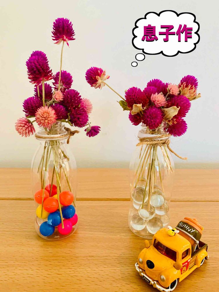 息子が庭の千日紅でドライフラワーを作り、飾りつけをしました🚘ビー玉を入れるなんて、なかなかの発想です🤠